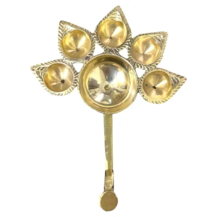 Brass Panch Aarti Diya with Handle | 5 Wick Traditional Oil Lamp for Pooja