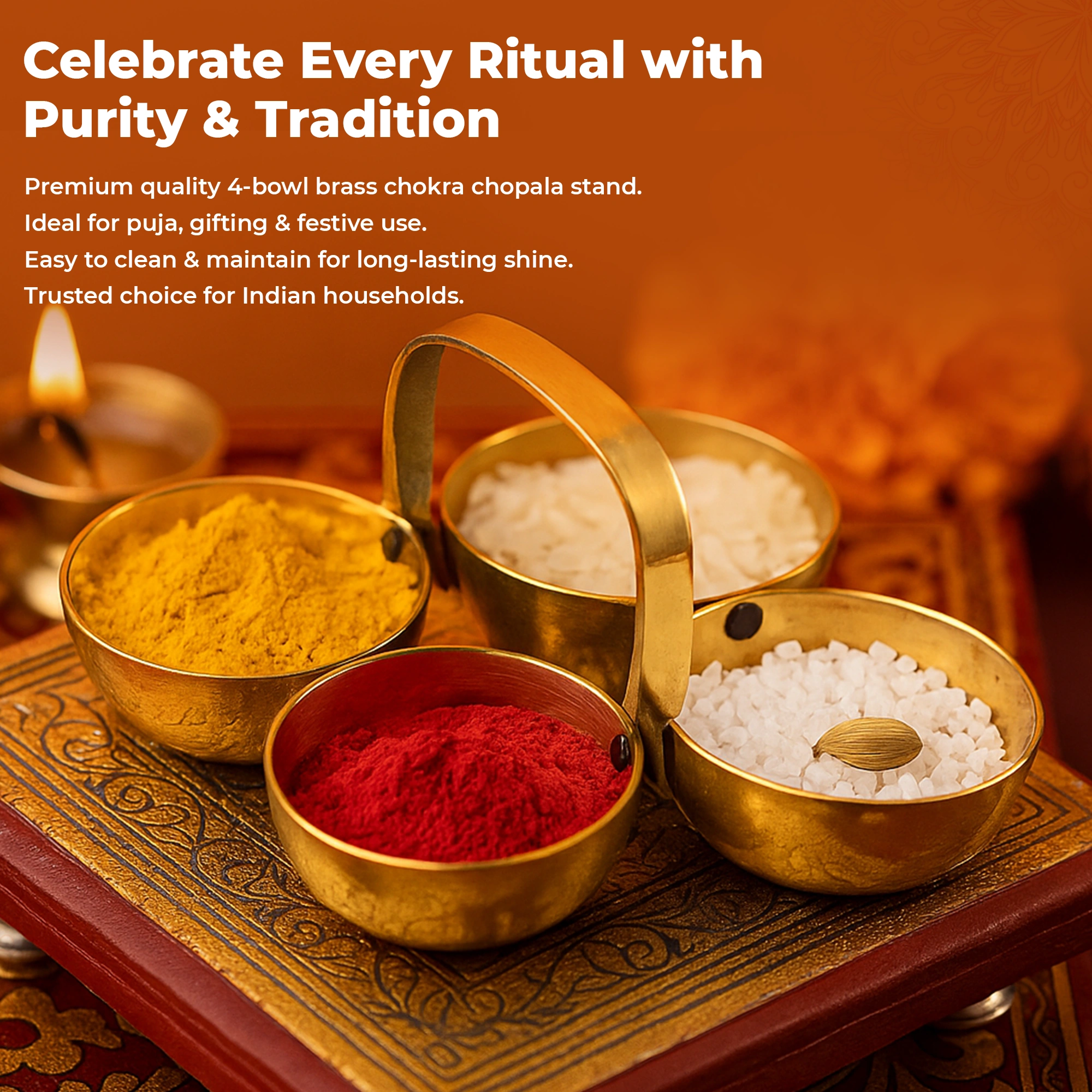 Celebrate every ritual with purity and tradition using this Chopra Stand with 4 Bowls, beautifully designed for pooja, festivals, and spiritual ceremonies.