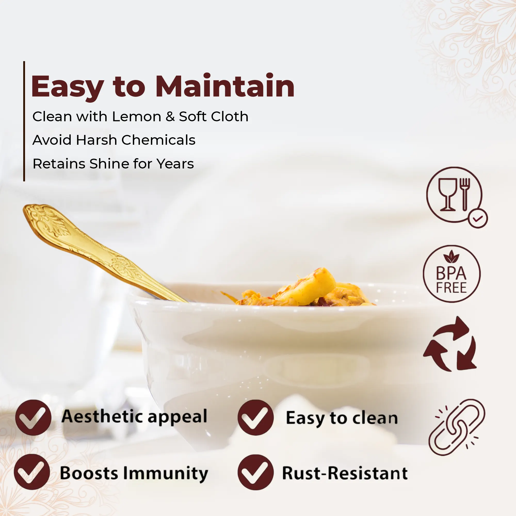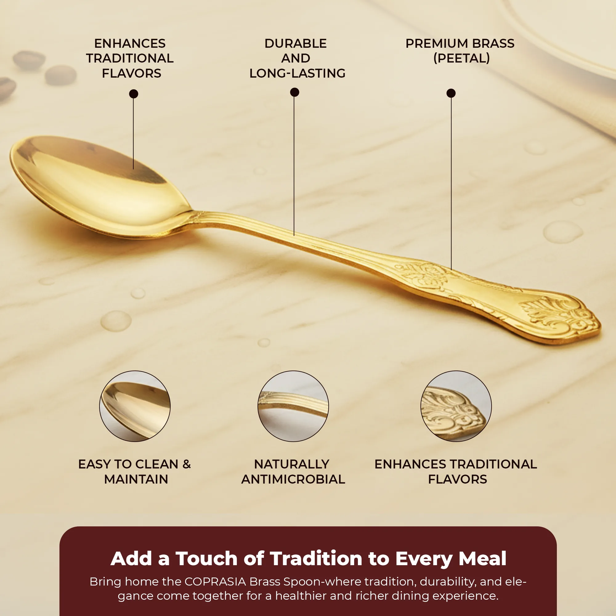 This brass spoon for dining is easy to clean and long-lasting, making it a practical and eco-friendly choice for your home. It is perfect for those who prefer traditional Indian kitchen utensils and want to bring authenticity to their meals.